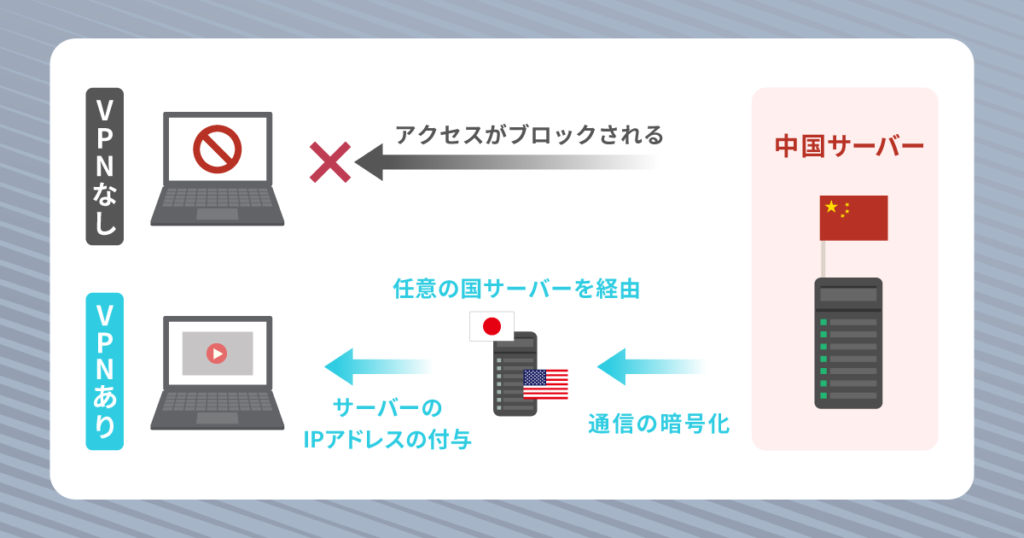 VPNを利用すると中国でインターネット規制を回避できる理由としては、主に以下2つの機能が関係しています。