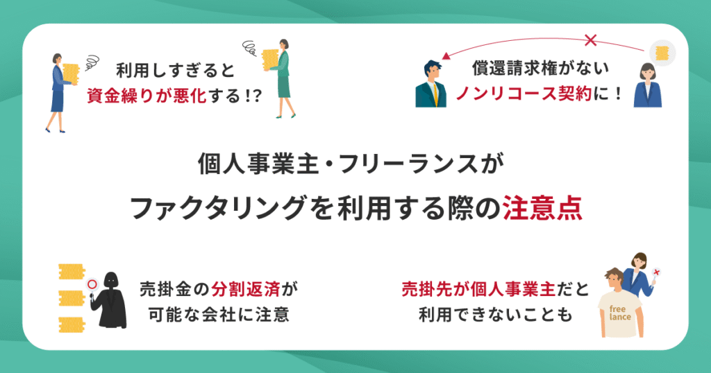 そのため、「個人事業主やフリーランスだから審査に落ちやすい」というわけではなく、「売掛金の未回収リスクが高い場合に審査に落ちる可能性がある」ということを理解しておきましょう。