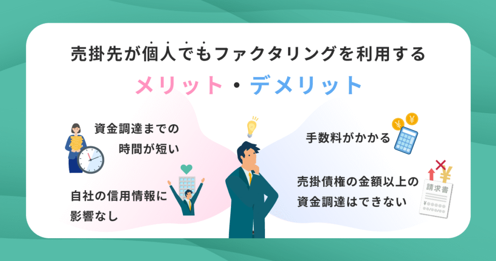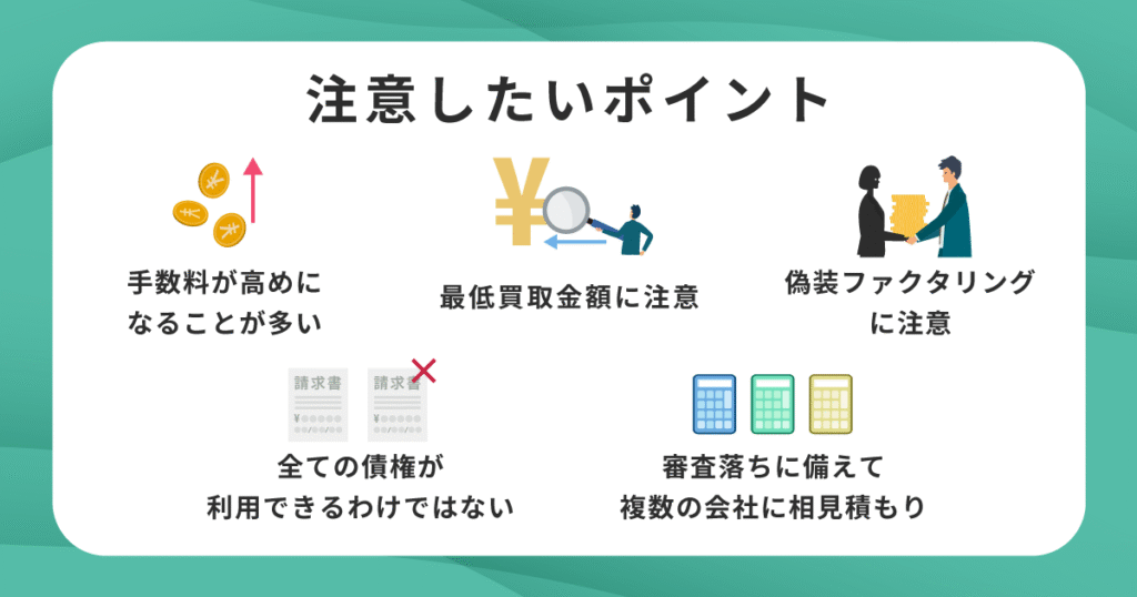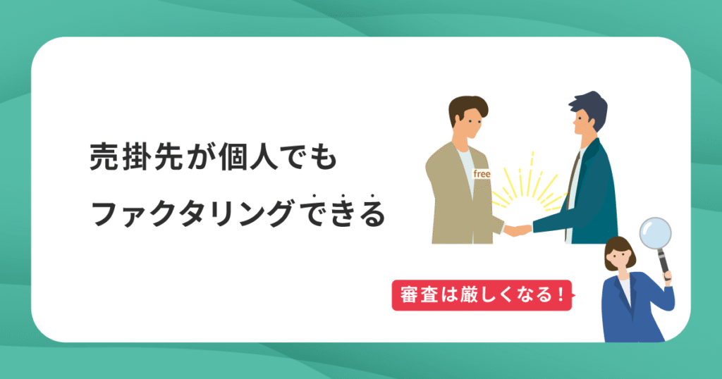 ただし、売掛先が法人の場合に比べて審査が厳しくなるなど、注意すべき点もいくつかあります。