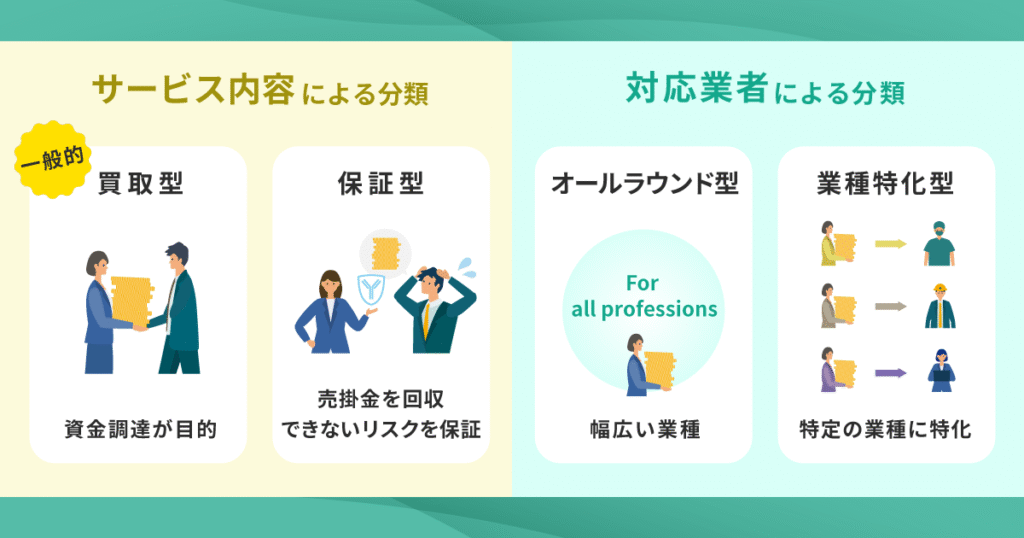 ファクタリングはサービス内容の違いにより、買取型ファクタリングと保証型ファクタリングに分かれます。