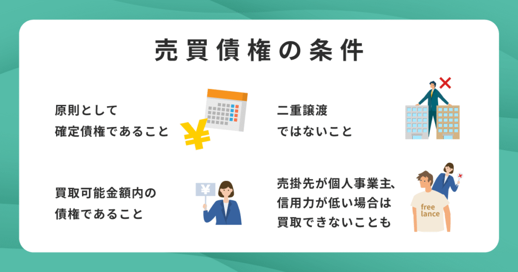 | 売掛先の信用力 | 法人か個人事業主か、事業規模・経営状況・信用情報はどうかなど |
