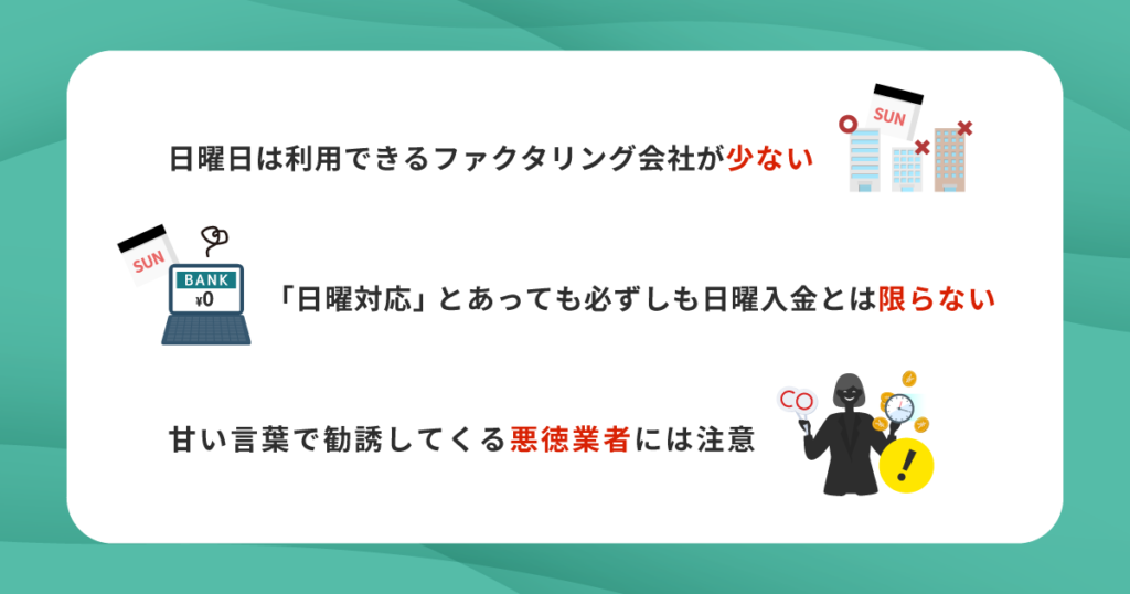 ただし、日曜日に対応しているファクタリング会社は限られるため注意が必要です。