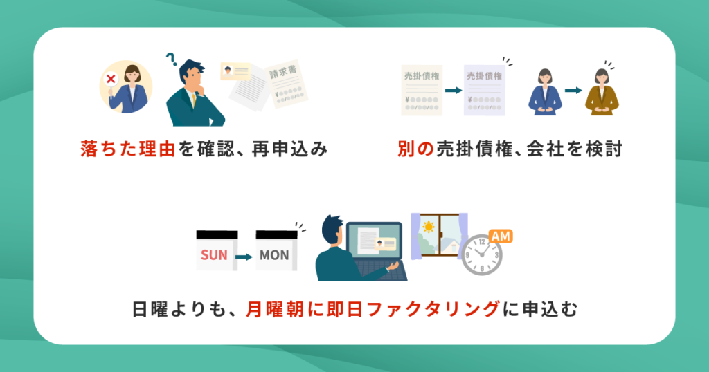 もしファクタリングで審査落ちした場合でも、すぐに資金調達を諦める必要はありません。