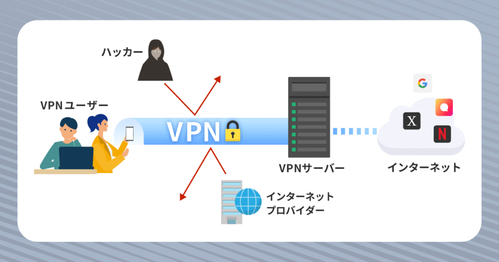 また、ユーザーとVPNサーバー間の通信は暗号化されているため、第三者に通信内容を盗み見られるリスクを軽減できる点も大きなメリット。