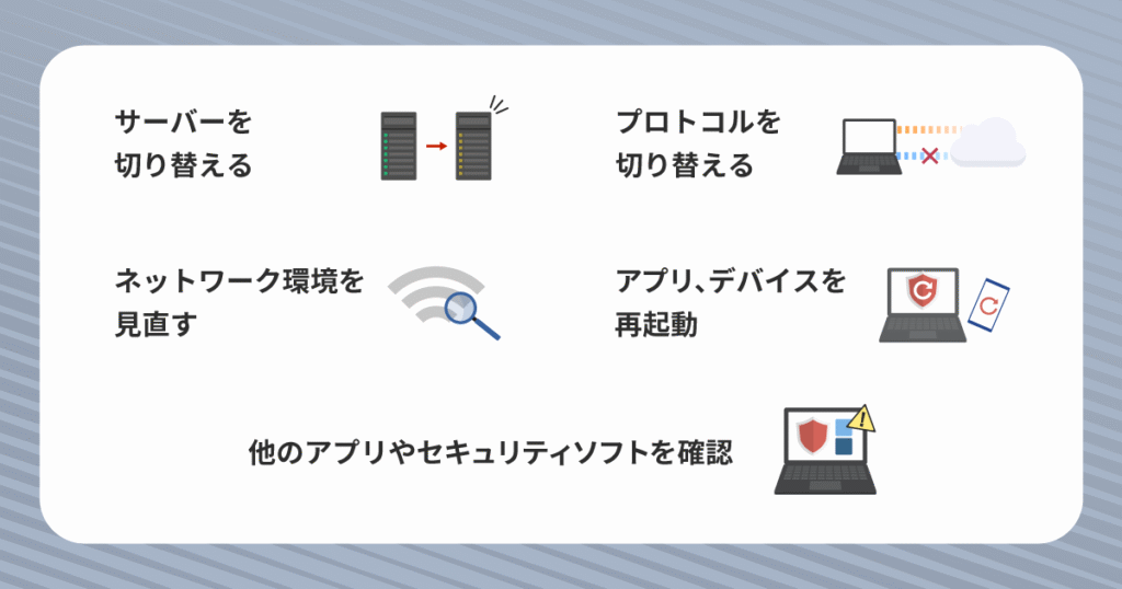VPNアプリや使っているデバイスに一時的な不具合が発生しているケースも考えられます。