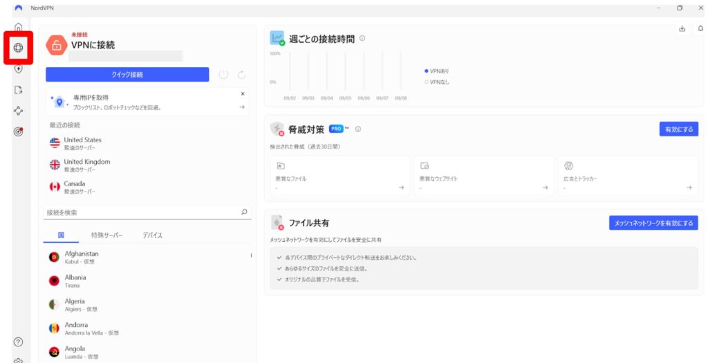 NordVPNの「クイック接続」のように自動的に最適なサーバーに接続してくれる機能もあるため、活用してみましょう。