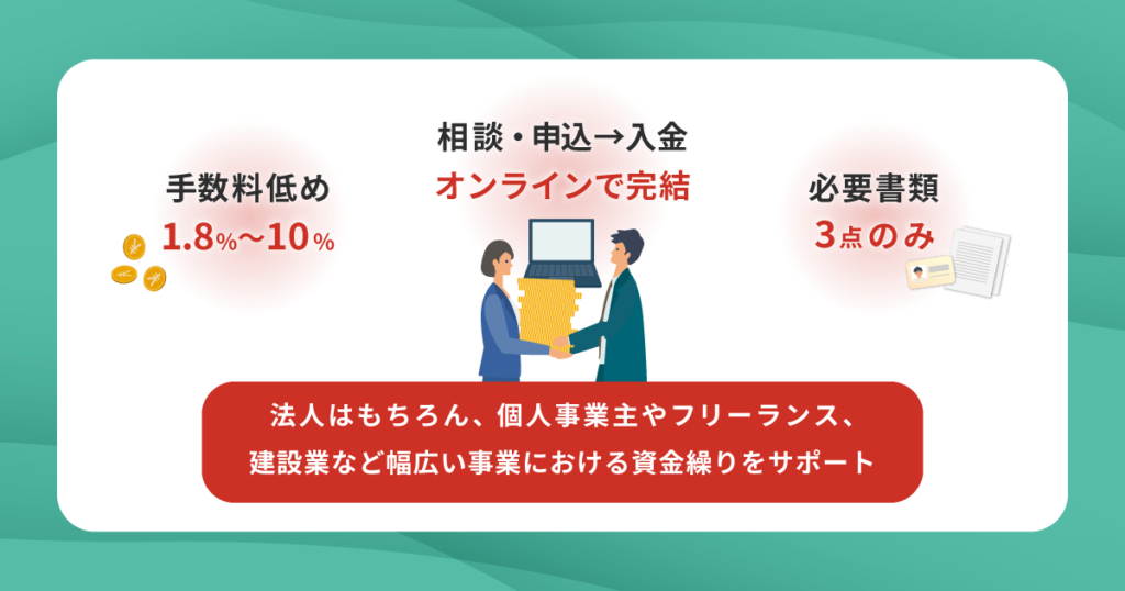相談・申し込みから入金までオンラインで完結するため、全国どこからでもスピーディーな資金調達が可能です。