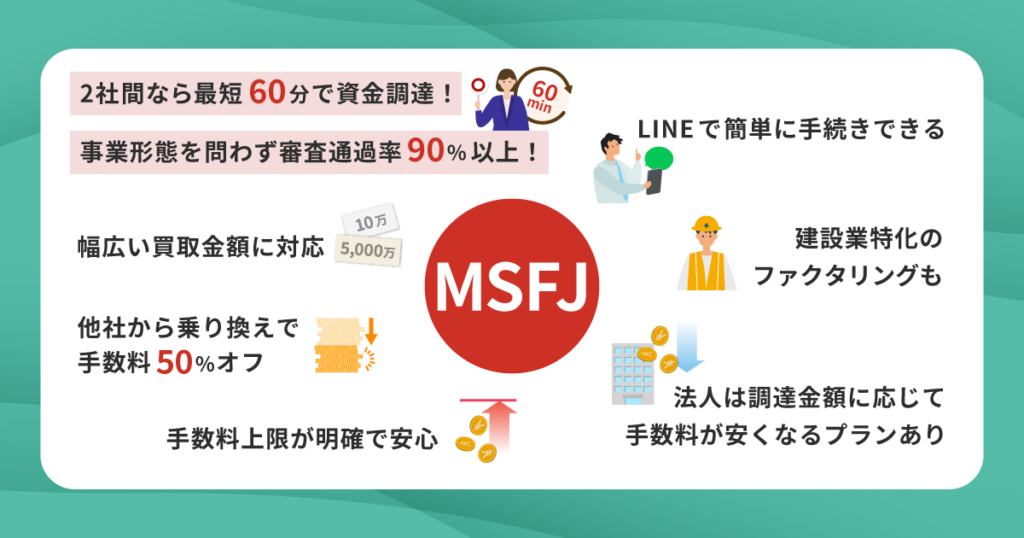 MSFJは、法人・個人事業主を問わず90%以上(※)の高い審査通過率と最短60分(※)入金のスピード対応で注目されているファクタリング会社です。