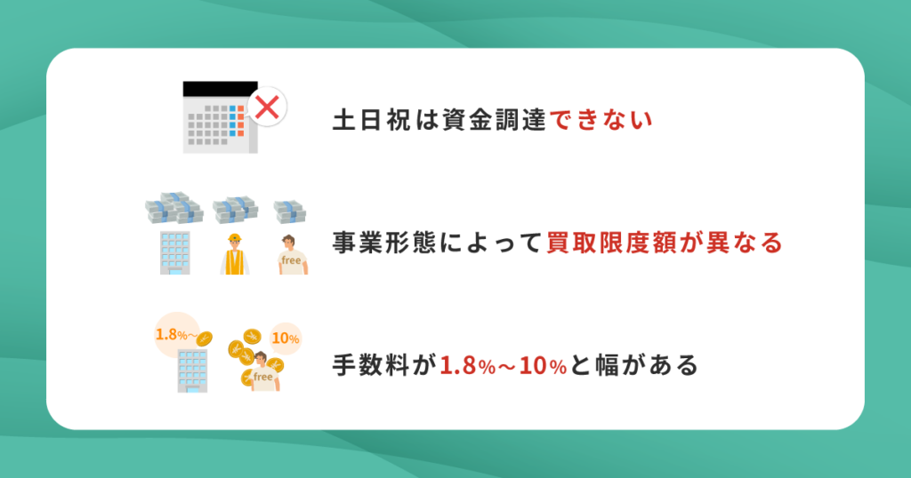 ただし、土日・祝日は利用できない点や、事業形態によって買取限度額が異なる点には注意が必要です。
