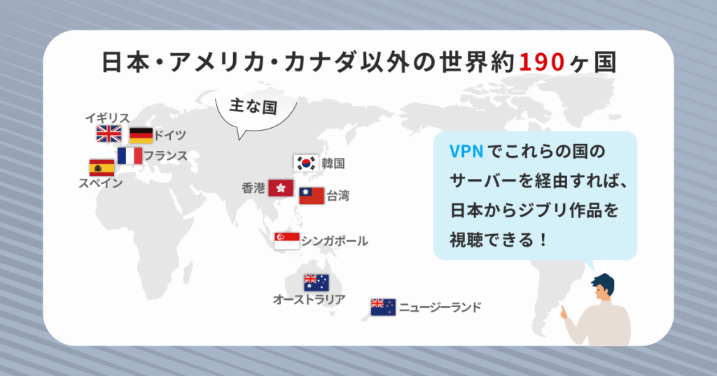 つまり、VPNを使って上記の国のサーバーを経由すれば、日本にいながらジブリ作品を視聴することが可能です。