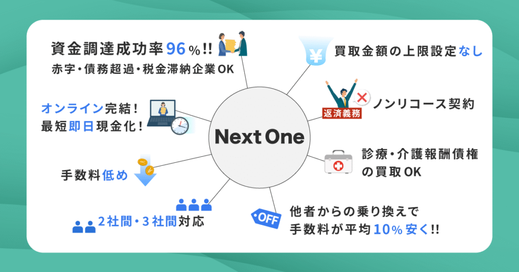 ネクストワンのファクタリングは即日現金化や乗り換えによる低手数料など、資金調達に悩む企業にとって心強いサービスです。
