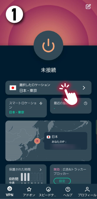VPNアプリを起動し、ロケーション(国)をタップします。(①)