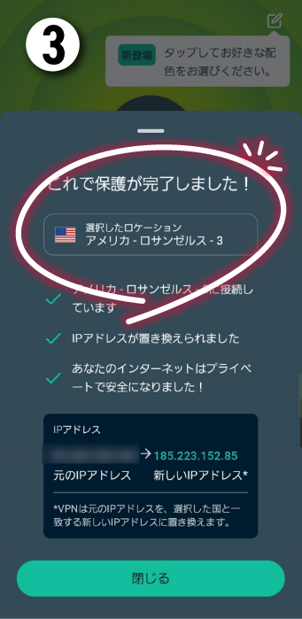たったこれだけの手順でIPアドレスが選択した国のものに切り替わりました。