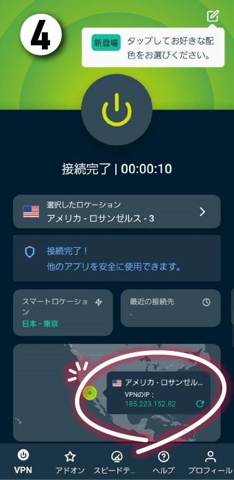 アメリカでしか利用できないサービスを日本から利用したい場合は、「アメリカ」のVPNサーバーを選択します(③)。
