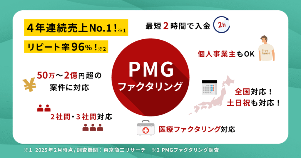- 4 参考:請求書で資金調達を最短2時間入金できる法人専用PMGファクタリング