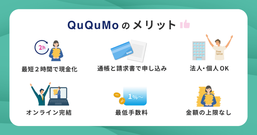 QuQuMo(ククモ)は、最短2時間で入金可能な2社間ファクタリングに特化したファクタリングサービスです。