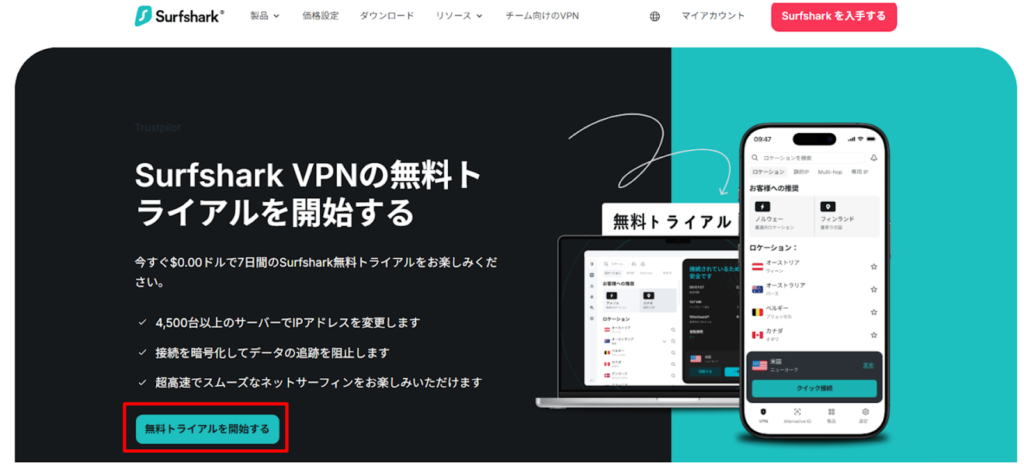 Surfsharkの無料トライアルを利用すれば、有料プランと同じ機能を実際の環境で試せます(※)。