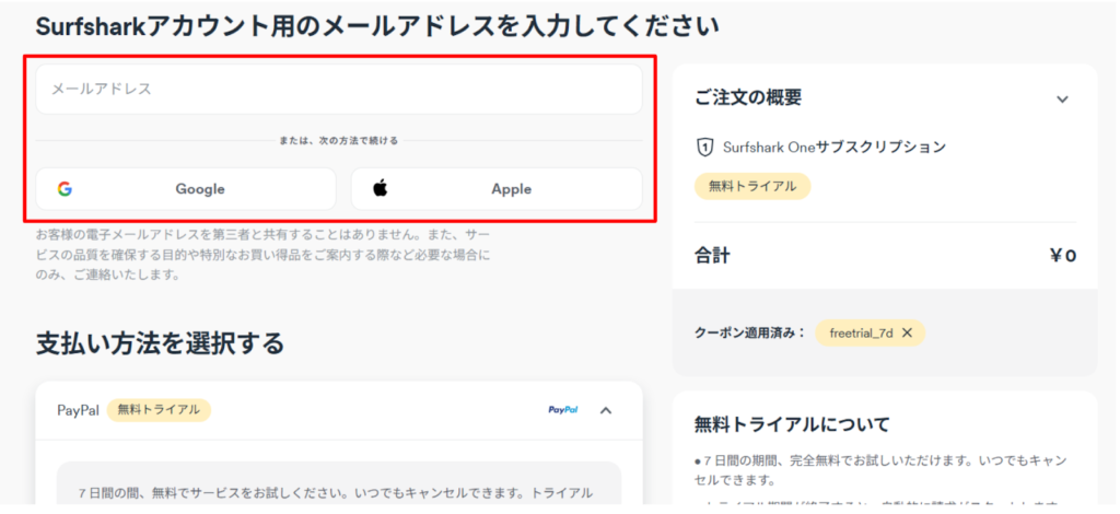 Surfsharkには複数の支払い方法が用意されていますが、無料トライアルを利用する場合は PayPalまたはクレジットカード を選択してください。