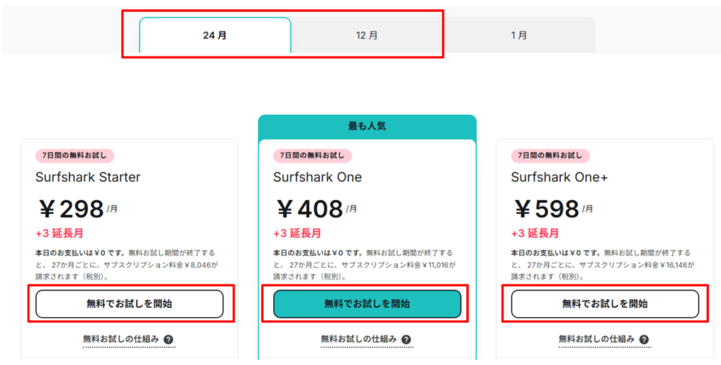 SurfsharkにはStarter、One、One+の3つの料金プランがあります。