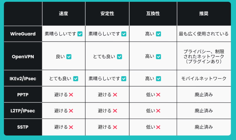 VPN接続では、プロトコルと呼ばれる通信ルールによって通信の安定性や速度が異なります。
