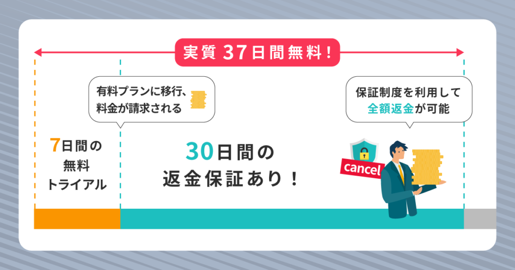 また、無料トライアル終了後に料金が請求された場合でも、契約日から30日以内であれば返金保証制度により全額返金を受けられます。