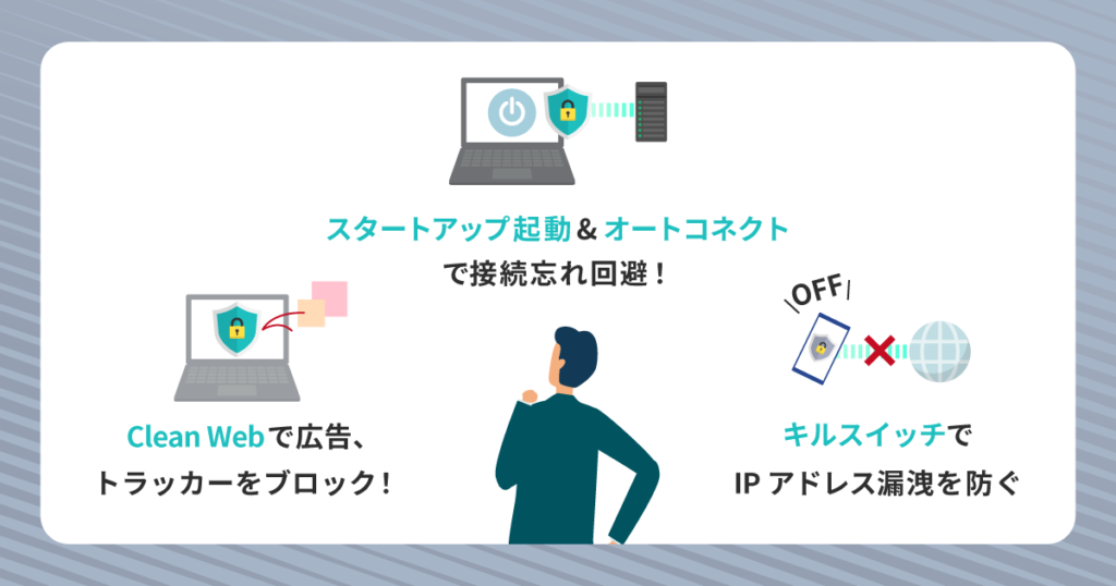 | VPN機能 | 広告・Cookieブロック、スプリットトンネリング、ダブルVPN、キルスイッチなどの基本機能 | 〇 | 〇 | 〇 |