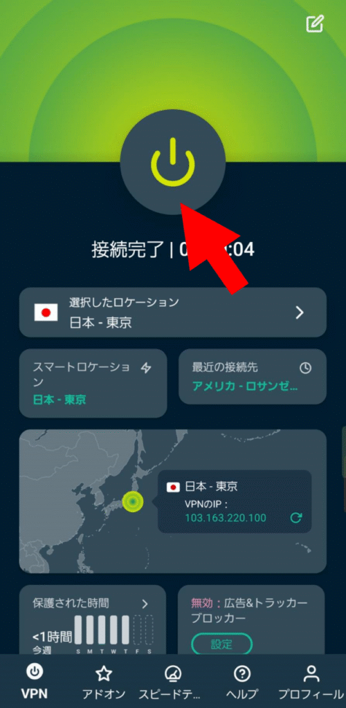 アプリを起動し、日本のVPNサーバーへ接続しましょう。