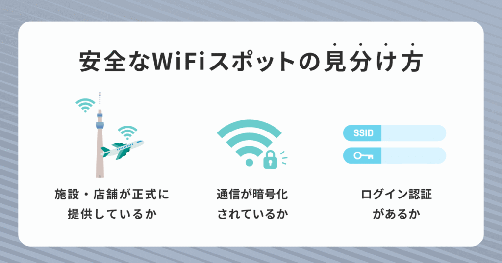 少しでも怪しいと感じたら接続を控え、施設や店舗のスタッフに尋ねるなど慎重な行動を心がけてください。