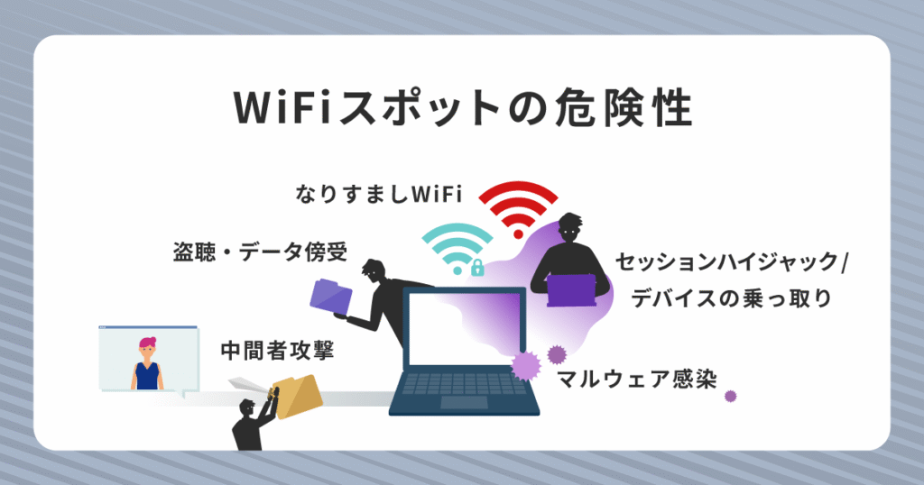 WiFiスポットは利便性が高い一方、不特定多数のユーザーが利用できるため悪意ある犯罪者が潜んでいる危険性があります。
