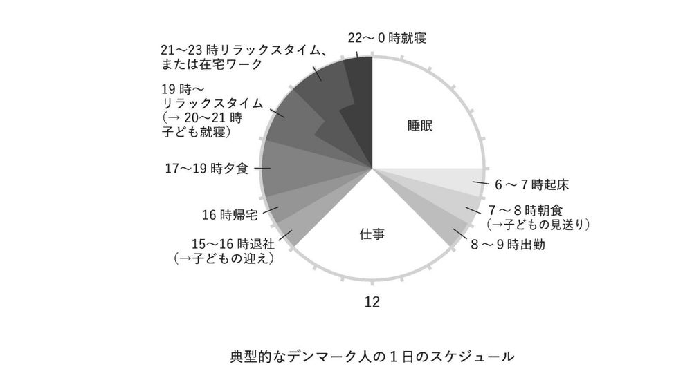 典型的なデンマーク人の1日を見ていきましょう。まず朝、子どもの見送りをしたら、8時から9時ぐらいに出勤します。そこから3時、4時ぐらいまで働いて、帰宅します。家族と一緒に夕ご飯を食べて、その後、家族でのリラックスタイムを設けています。
