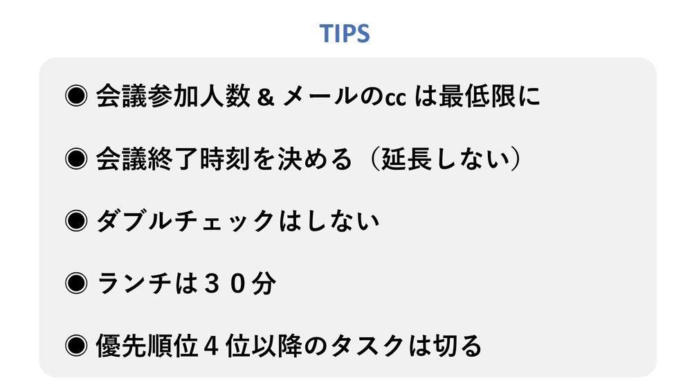 ここで、日本で今すぐできそうなことをピックアップしてみました。例えば、会議の参加人数、メールのCCは最低限にする。会議終了時刻を決める。延長はしない。ダブルチェックはしない。ランチは30分。日本だとランチがおいしいので30分は難しいかもしれないですけど。優先順位4位以降のタスクは切る。といったことだったら意識できるのではないかなと思いました。