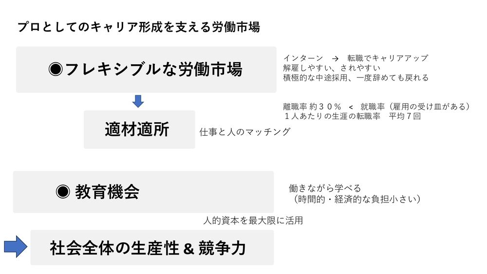 それによってどんどん転職していける環境があって、1人あたりの生涯の転職率は平均7回になっています。この回数はもっと増えるだろうと言われています。こういった環境があるので、社会の中で自然に適材適所ができていく。そういった環境があります。