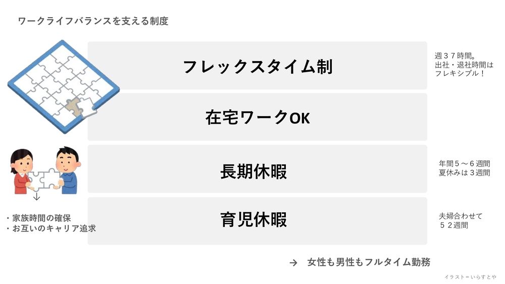 こんなデンマークのワークライフバランスを支える制度は、フレックスタイム制、在宅ワークOK、長期休暇、育児休暇、こういった制度が挙げられます。