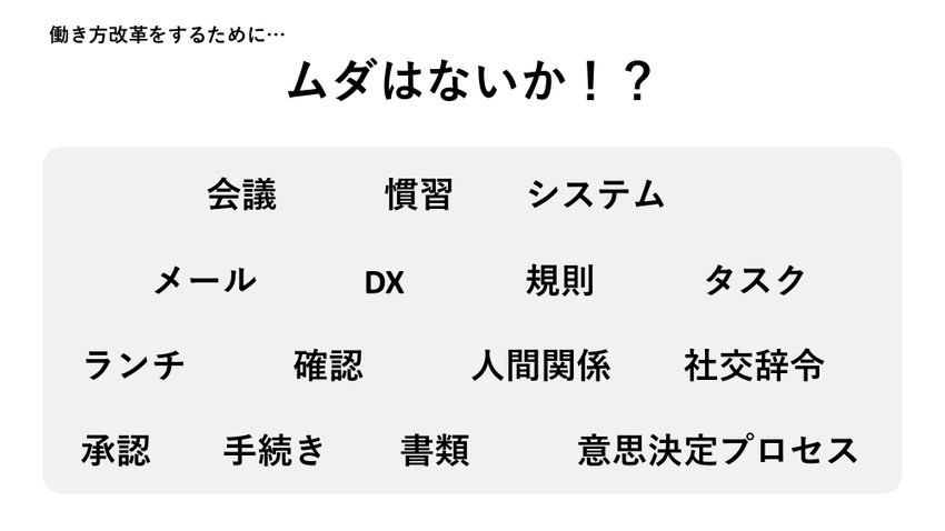 では、どうやって働き方改革をすればいいのでしょうか? というところですが、ペニーレさん(いわく)、「とにかく無駄を減らすんだ」ということです。会議、慣習、システム、メール、DX、規則、タスク、ランチ、確認作業、人間関係、社交辞令、承認、手続き、書類、意思決定プロセス。「もういろんなありとあらゆる側面から無駄を徹底的に省いていくことだ」とおっしゃっていました。
