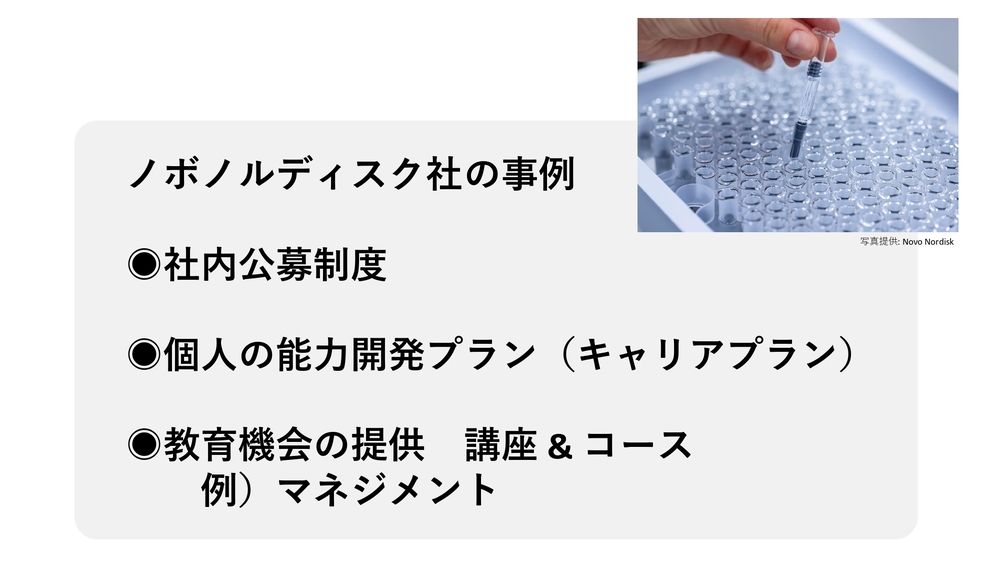 ということで、社内で適材適所をどう実現するか。こちらを、製薬会社ノボノルディスク社の事例で見ていきましょう。ノボノルディスク社では、1つは社内公募制度を設けています。どこかでポジションが空いた時に、その部署だけじゃなくてほかの部署からも応募できるようになっています。