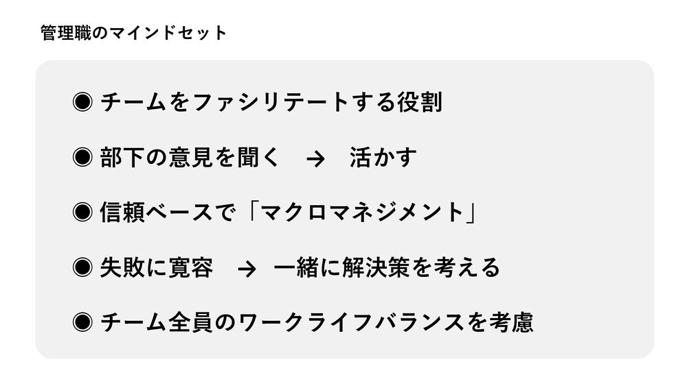 管理職というのは、チームをファシリテートする役割という意識を持っています。そして、部下の意見を聞いて活かしていくことを大切にします。そして、信頼ベースでマクロマネジメントの組織運営をします。