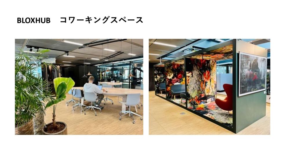 シェアオフィス、コワーキングスペースだけではなくて、企業もそういったオフィス作りに取り組んでいます。こちらは製薬会社ノボノルディスク社の本社なんですけれども。このような感じで、入るとロビーに緑があって、吹き抜けのスペースがあって、上が天窓という感じで非常に開放感があるオフィスになっています。
