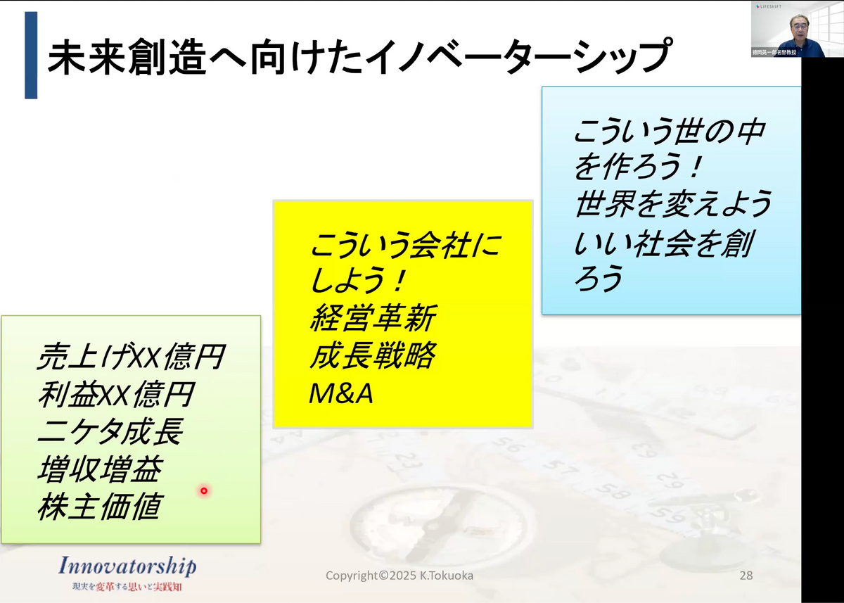 ここ(こういう世の中を作ろうという水色のゾーン)をイノベーターシップと言います。こちら側(売上XX億円などの黄緑色のゾーン)はマネジメントで、これ(こういう会社にしようなどの黄色のゾーン)がリーダーシップと言います。