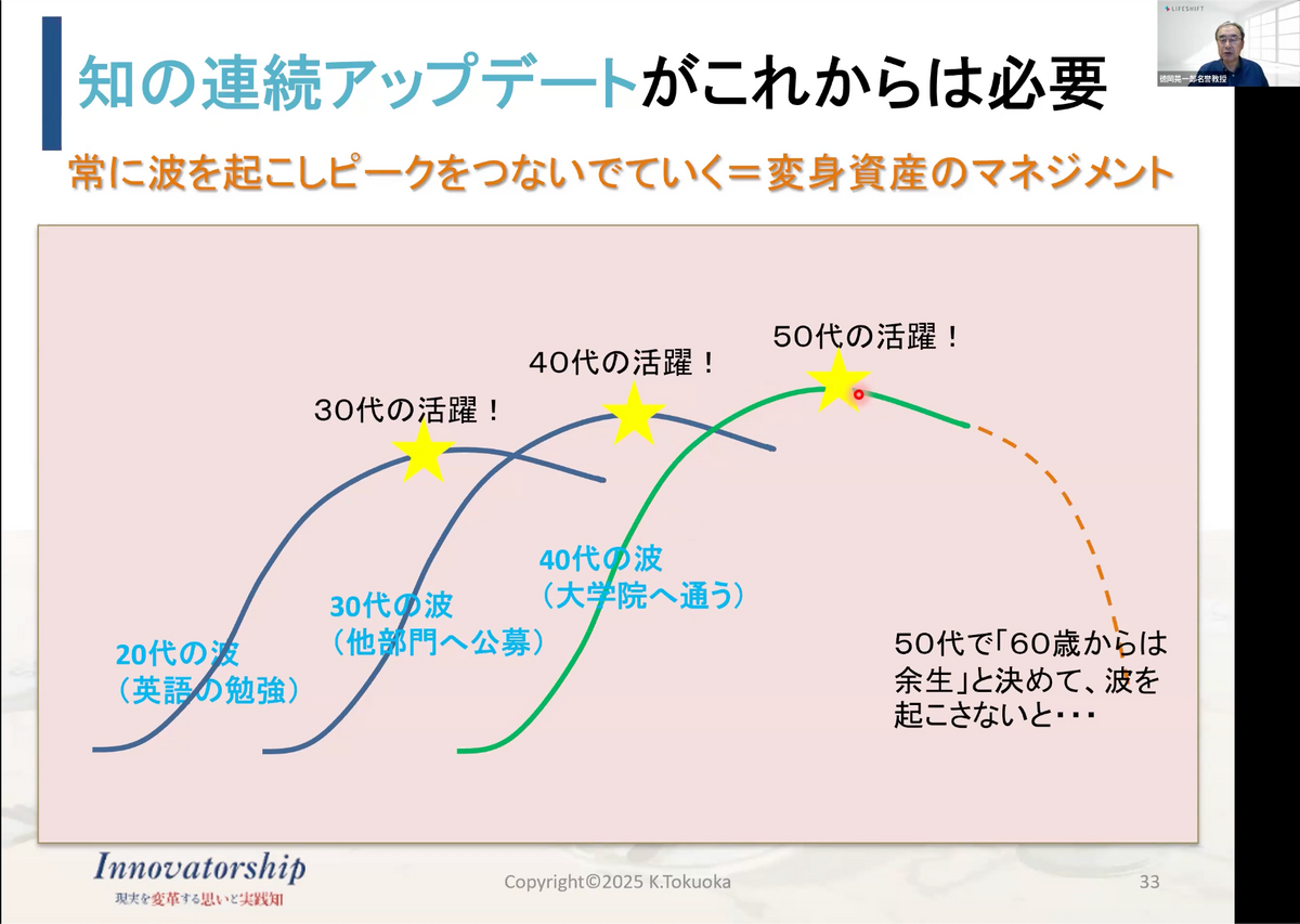 なので50代になっても、またさらに勉強(副業、NPOなど)しますという波を作る。大学院はここに寄与してると思っています。そうしないと、この時代の人口減少、高齢化、テクノロジー、ポストコロナといった波を乗り切れないと思いますね。