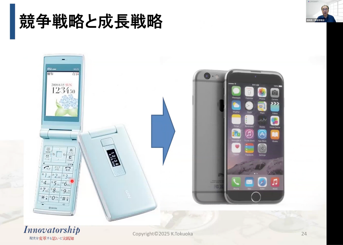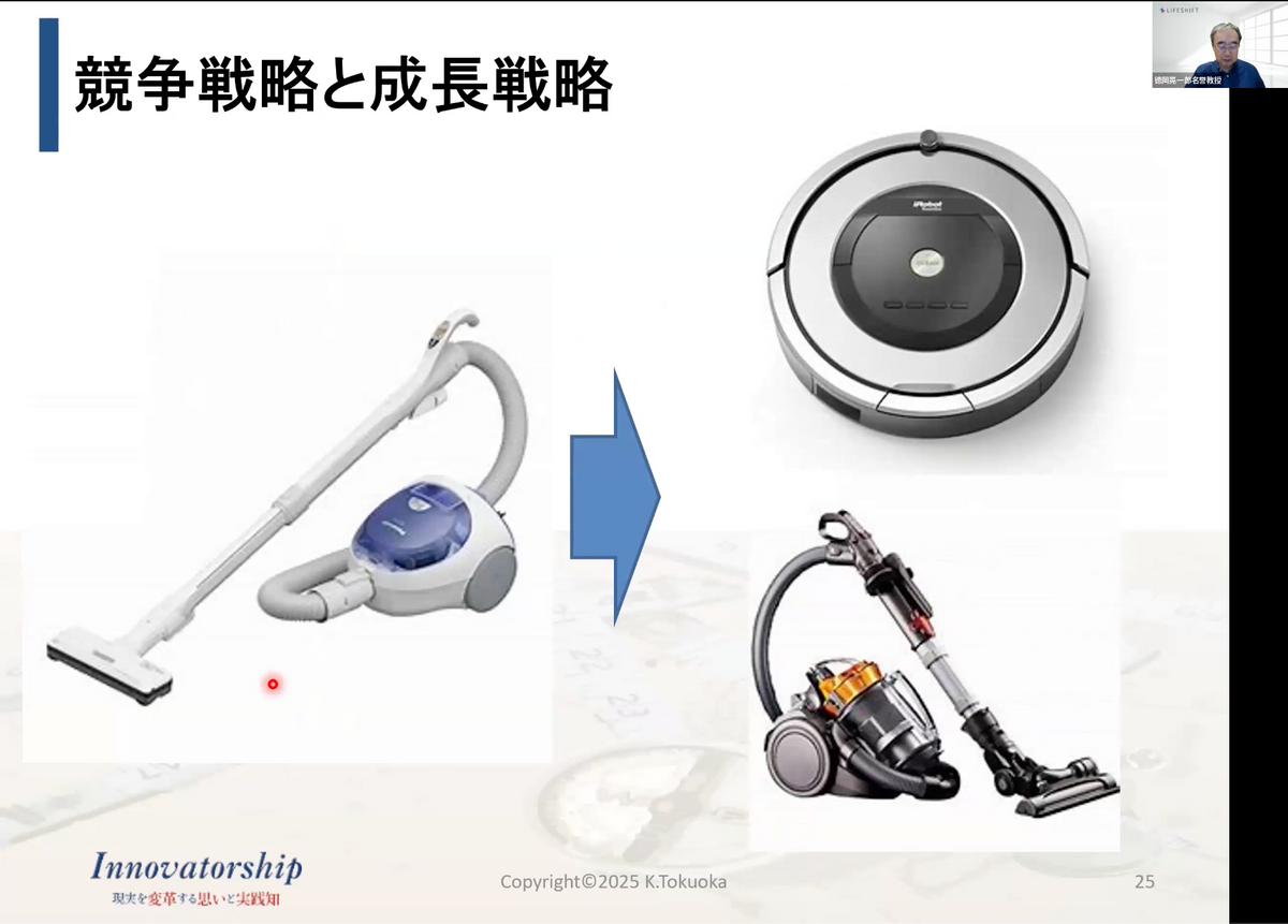 イメージとしては、競争戦略だけをやっていると、その未来からバックキャストしてきた人に負けちゃうよねと。今がんばる(図内では従来型の掃除機)っていうのもあるんだけども、ぜんぜん違う発想(図内でロボット型の掃除機)で来た人には負けちゃうよねと。