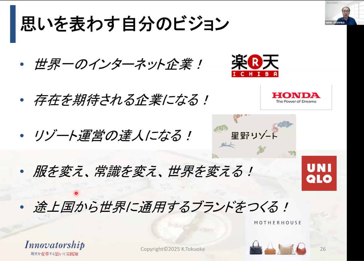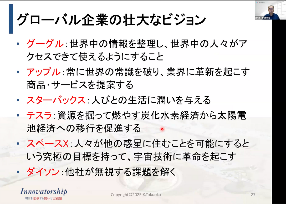 徳岡:その時に、どれだけ未来を見るかがすごく大事なんですね。これ(楽天、Honda、星野リゾート、UNIQLO、MOTHERHOUSEのビジョン)、けっこういいキャッチコピー的なビジョンだと思うんですけども。これを次のページと比較してみてほしいんですけども。こういう(グローバル企業の壮大な)ビジョンもあるわけです。
