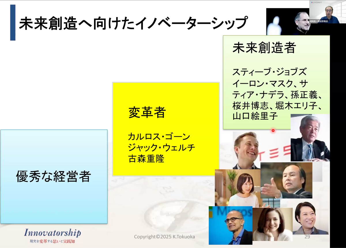 (海外の)ITの人たちが目立ちますが、日本にもいらっしゃる(孫正義、桜井博志、堀木エリ子、山口絵理子)。ぜひこういった世の中、未来に対しての思いを持ってもらう。そういった志、視点を持ってもらうのが、このイノベーターシップで現実を変革する思いと実践知です。