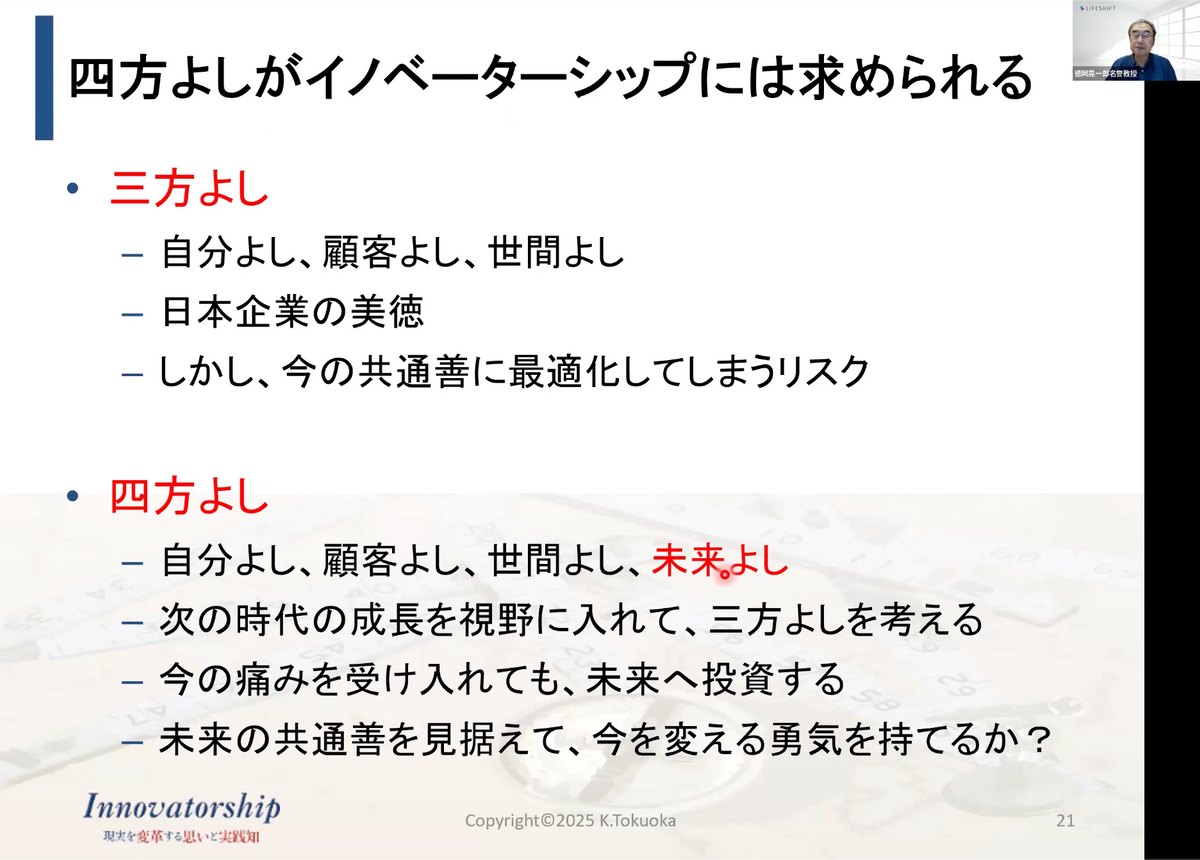 今の時代を考えてみると、四方よしが重要です。未来よしまで考えて、視野に入れないとまずいんじゃないか。現在にちょっと痛みを持ったとしてもね、未来に向けて考えて投資する。それがすごく大事になります。全部はできないですからね、やっぱり何かを犠牲にして次を狙っていくことも大事になります。