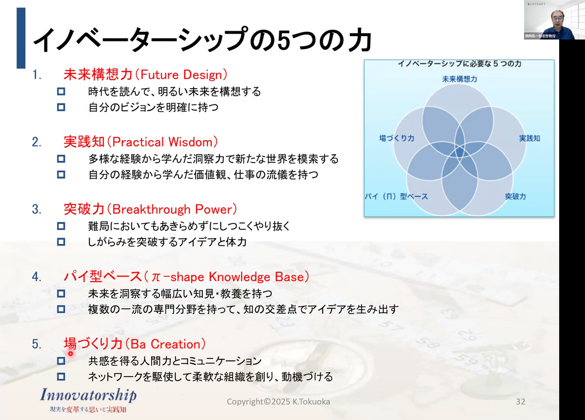 徳岡:私は「イノベーターシップ」という授業も持ってるんですが、5つの力を提唱していまして。授業では1個ずつやっていきます。1つめが、未来を見る「未来構想力」。どうしたら時代を読んで未来を見る力がつくか。