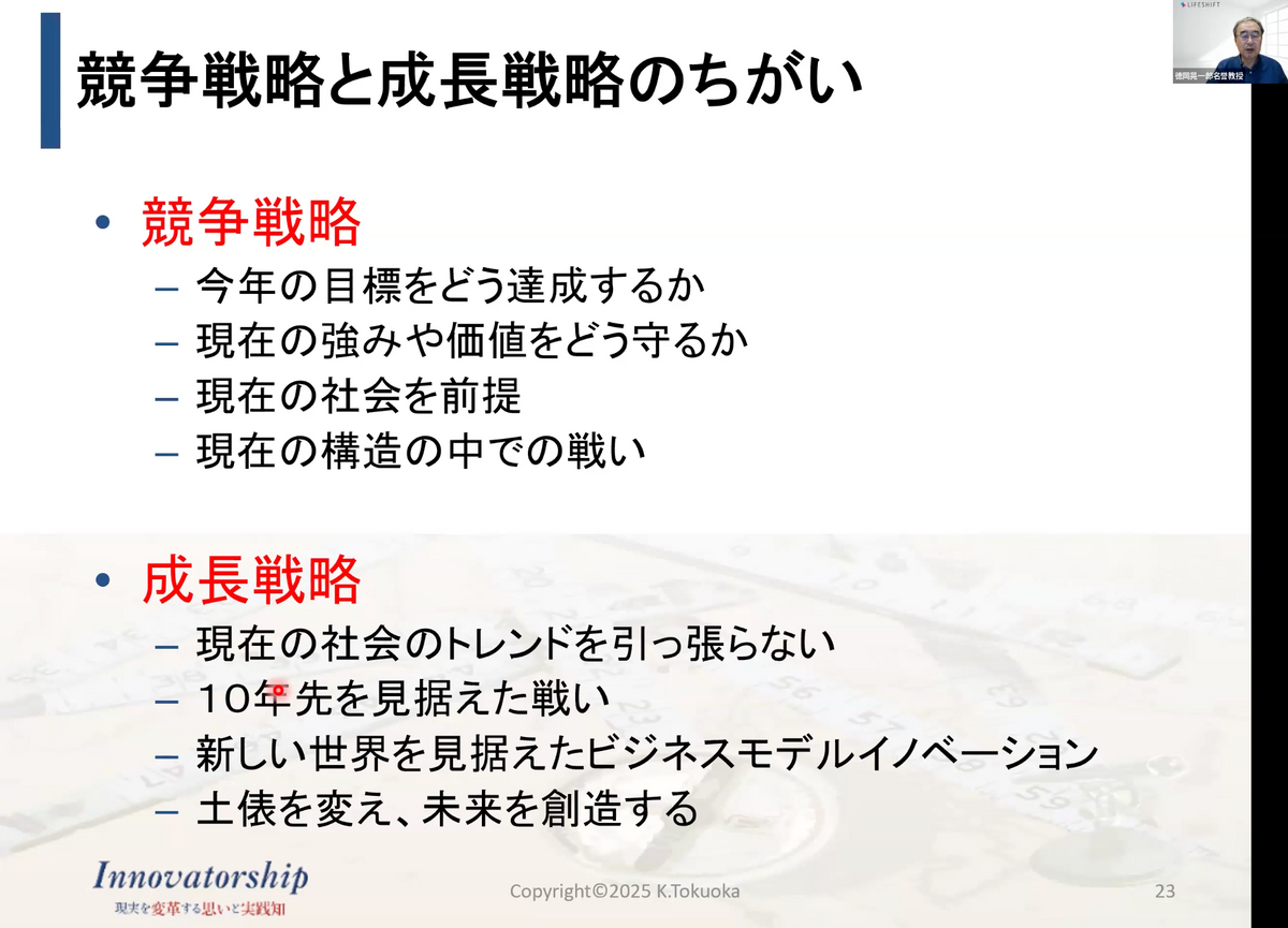 企業経営で言えば、今の勝負に勝つための競争戦略も重要なんですけども、成長戦略が大事なわけですよね。未来を見ていかないと足をすくわれます。これは戦略論をやったら必ず出てくるコンセプトなわけですけど、我々はこちら側(成長戦略)に自分の時間をかけていかないと、企業も良くならないし、自分の人生も尻すぼみになっちゃいます。