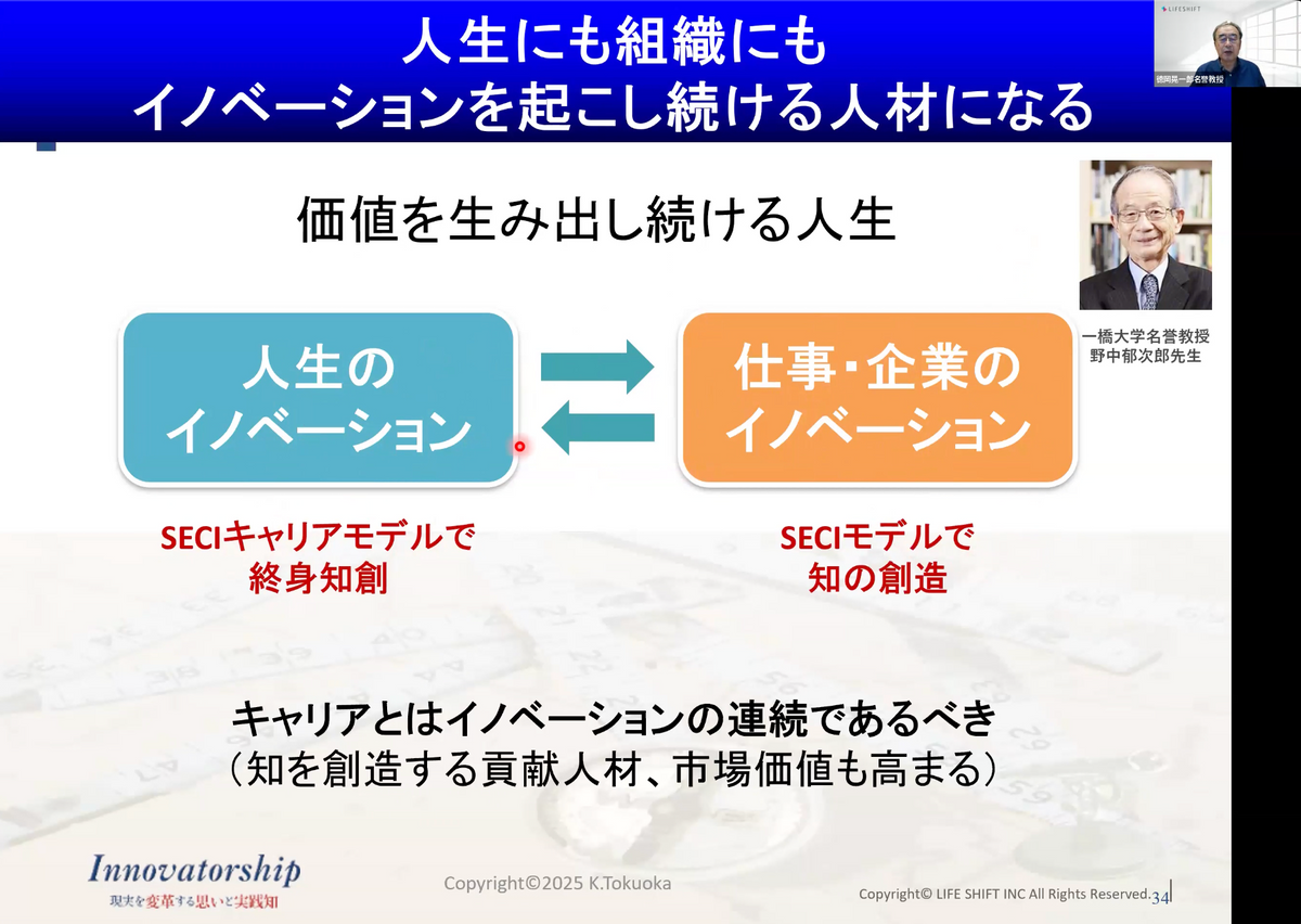 このイノベーションのモデルを「SECIモデル」(従業員の知識や技能の中から暗黙知を組織的に管理して、形式知化するための理論)っていうんです。これはつい先日亡くなられた、一橋大学の野中(郁次郎)先生の提唱したコンセプトなんですけど。私はSECIキャリアモデルって言っていますけども、人生のイノベーションモデルというものは(仕事、企業のイノベーションと)一緒に回ってると思うんですね。