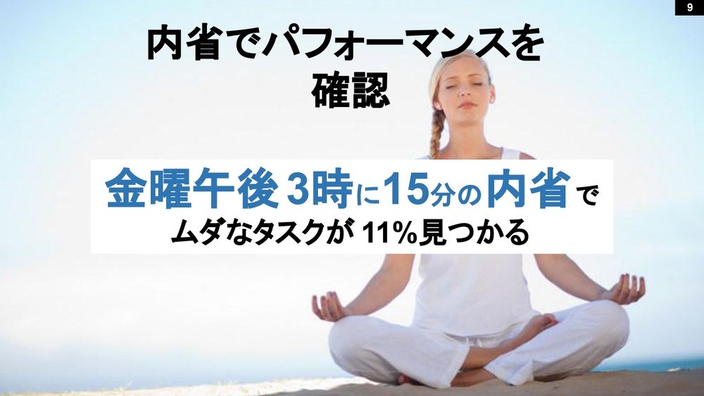 なのでおすすめは、金曜日の午後3時に振り返る。これだけで無駄な作業が11パーセント減ります。振り返りの時間は金曜日がおすすめです。実際に17万3,000人に(時間の)体重計に乗ってもらったので、参考までに最新のデータをご覧いただきます。