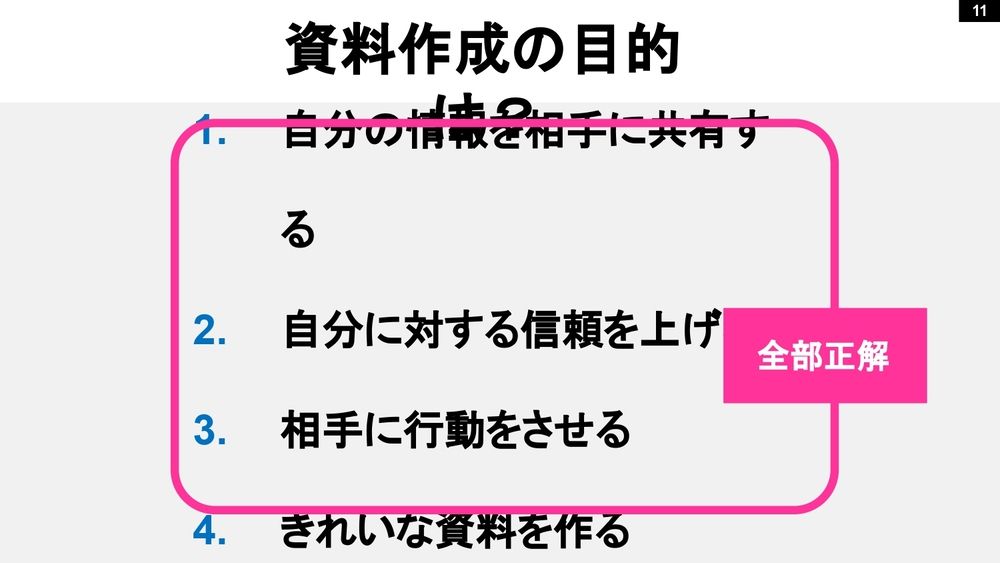 何のために資料を作っているのか。間違っていてけっこうなので当てはまる数字をチャットに入力してください。みんな「3」「3」「3と1」。「全部」っていうズルイのもありますね。「1」、「2」、「1」、「2」、「3」、「全部」、「3と2」。バラバラなので整えましょう。じゃあ、答えにいきます。