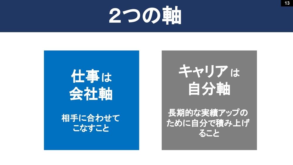 キャリアは自分軸です。長期的にどういうスキルを磨いていくかは会社が考えてくれないので、キャリアは自分軸。つまり会社軸で給料をもらっている時は、ちゃんと言われたとおりにやって信頼を高めておいたほうがいいんです。これは規定演技ですから。その後の自由演技の時はしっかりと自分が表現したいものを出す。