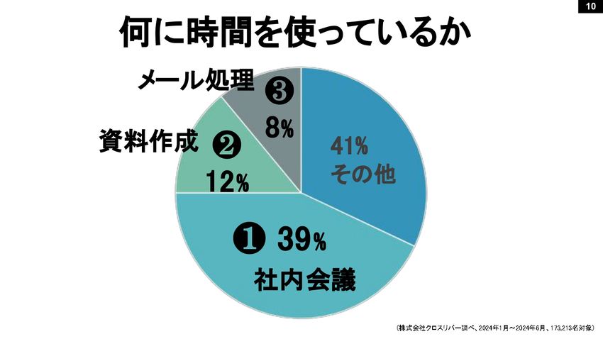 なんと、全国の17万3,000人のビジネスパーソンは、1週間の働く時間のうち39パーセントが社内会議です。資料作成12パーセント。メール処理はビジネスチャットに移っているから8パーセントに減っています。